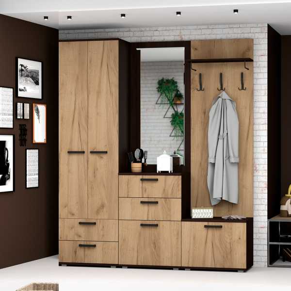 Пример решения: Модульная прихожая Авиньон. Это пример продуманной системы, где есть все для комфортного хранения. Обратите внимание на выдвижные ящики на уровне пояса — в них невероятно удобно хранить ключи, перчатки, шапки и другие мелочи, которые всегда должны быть под рукой. Цветовое решение «Дуб Крафт»/«Золотой Графит» — это модное сочетание натуральности и благородного серого оттенка.