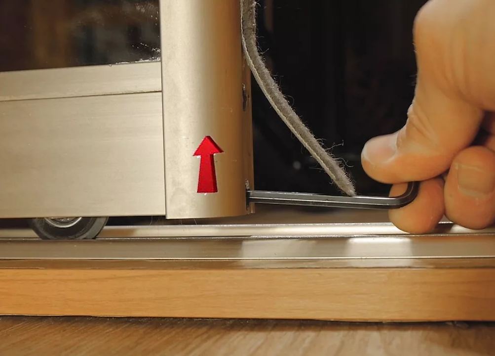 - Найдите регулировочный винт в торце двери, в районе нижнего ролика.