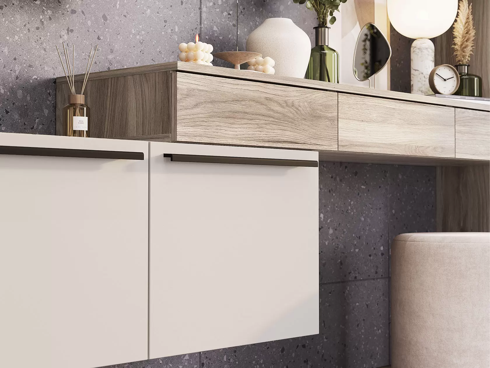 - Универсальная основа: Корпус всех модулей выполнен из ЛДСП «Дуб Смоки» — дымчатый нейтральный оттенок с мягкой текстурой, который служит идеальным фоном для любого интерьера.