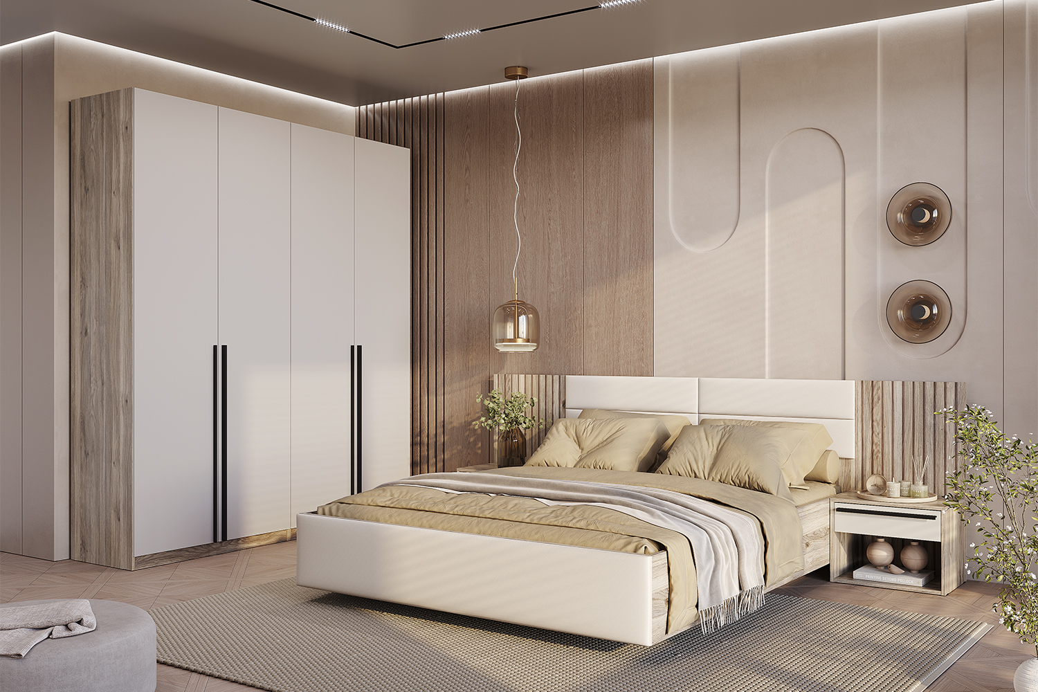 Сформируйте гармоничное пространство для отдыха. Вместительные шкафы, практичные комоды и прикроватные тумбы обеспечат идеальный порядок.