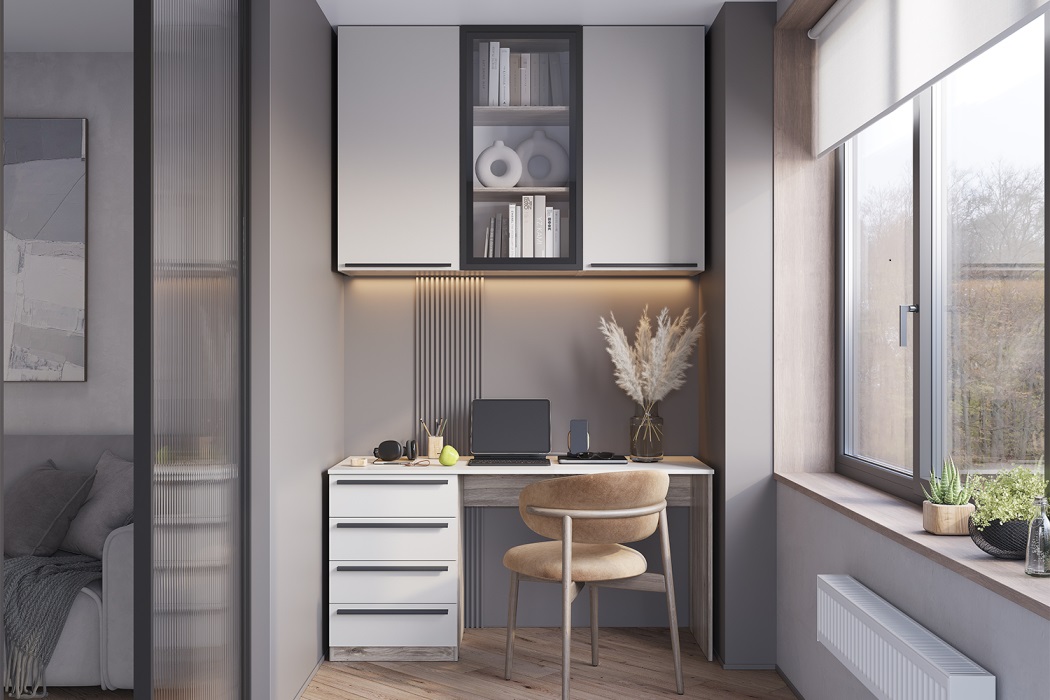 - Трендовый акцент фасадов: Контрастную ноту вносят фасады из ЛДСП «Кашемир». Этот нежный, теплый серый оттенок находится на пике популярности в современном дизайне интерьеров. Он добавляет композиции глубины и утонченности.