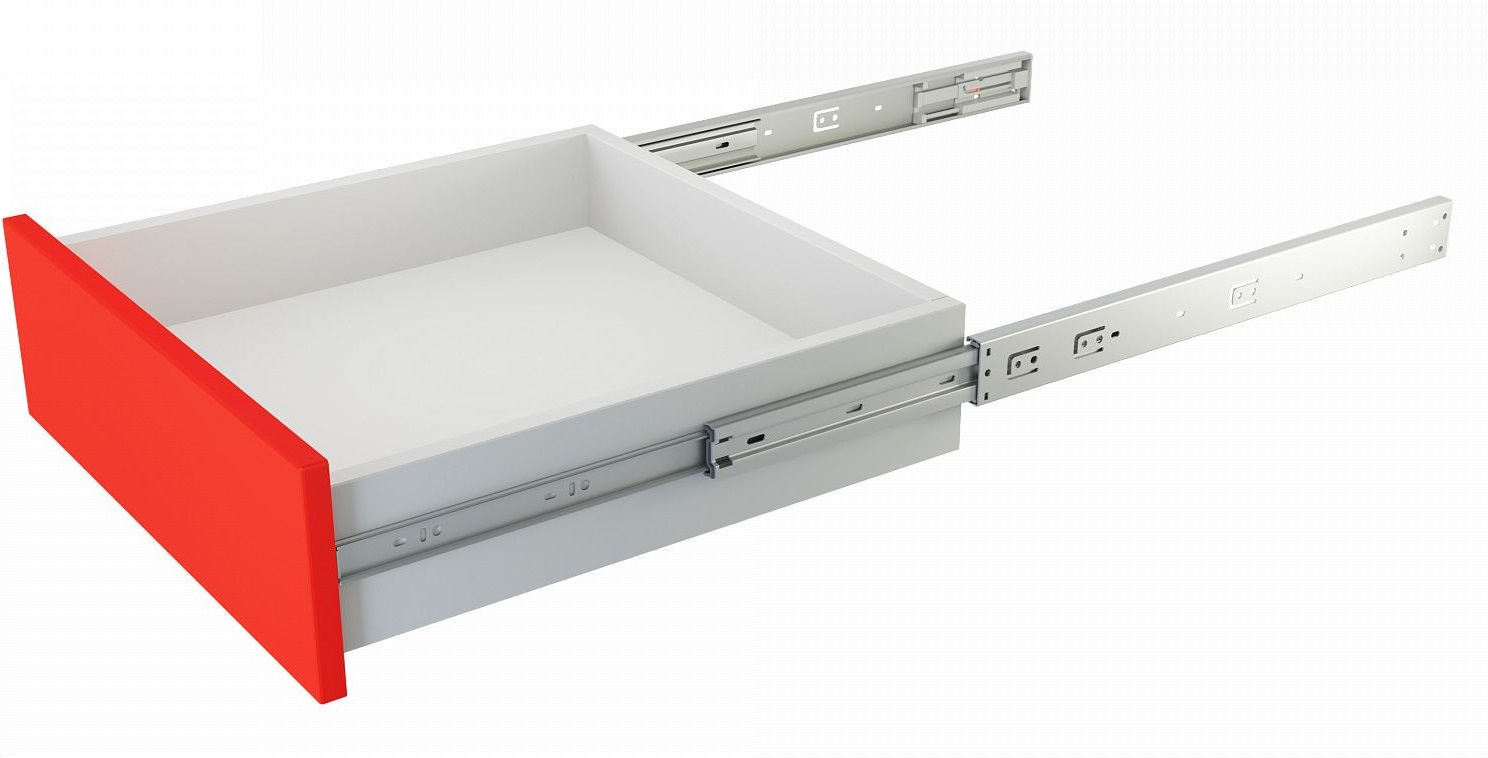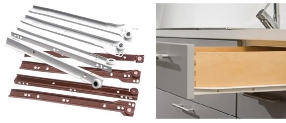 - Важно: Широкая часть крепится к боковой стенке шкафа, узкая — к боковине ящика.